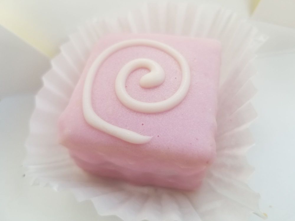 A mini four-bite cake to be eaten with tea, presumably, or just by itself if you're me. It's got three layers of white cake and two layers of frosting, in this instance raspberry; plus of course the frosted exterior. A simple delight. Also comes in vanilla or lemon.